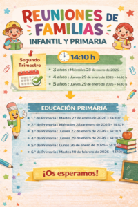 Informamos de las fechas previstas para la celebración de las reuniones generales de familias correspondientes al segundo trimestre, tanto en Educación Infantil como en Educación