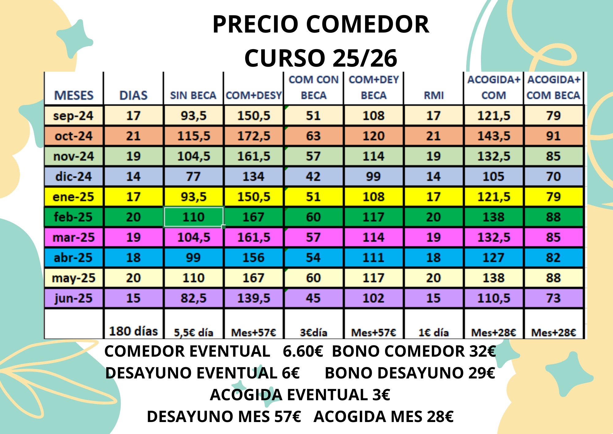 Los precios oficiales del comedor escolar se actualizan anualmente según la normativa de la Comunidad de Madrid. Puedes consultarlos aquí: